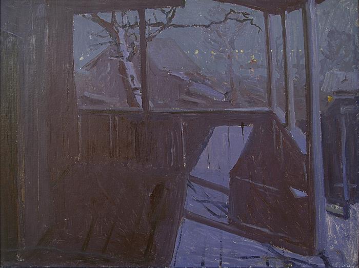 "Сиреневый этюд" ночной пейзаж - масло живопись ночь туман деревня дом